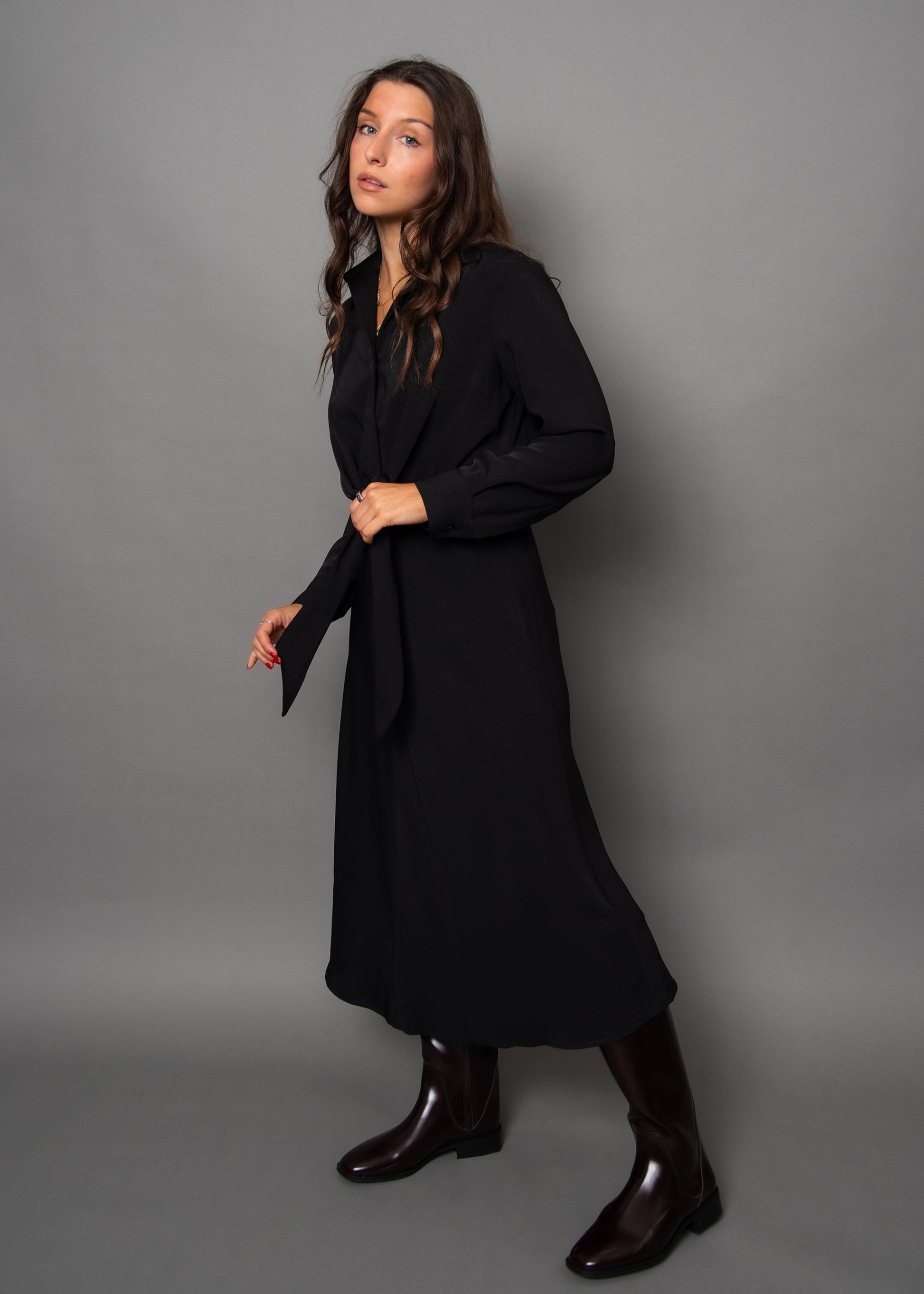 This black front tie midi dress features a sleek and stylish look, perfect for any occasion. The midi length and double layered design provide a flattering silhouette, while the collar and button cuffed sleeves add a touch of sophistication. Features 3 buttons from the waistline up.