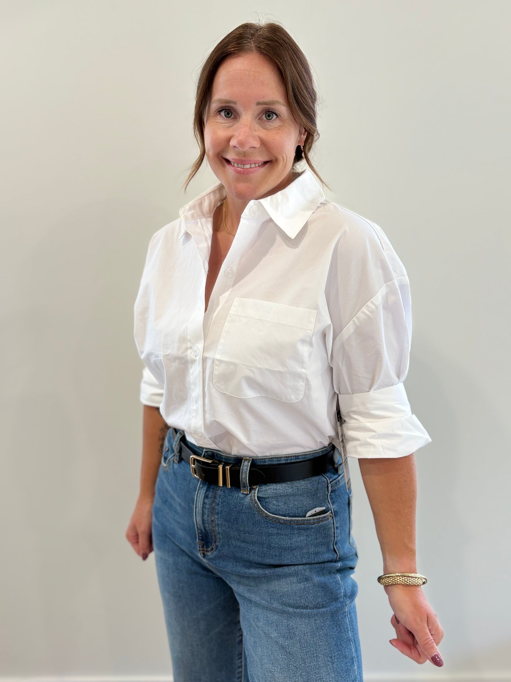 This Kerwin Classic Collared Shirt in white is a must-have for any professional wardrobe. The button down dress shirt is slightly cropped with a boxy fit for a modern touch and can easily transition from the office to a night out with friends. Made with quality materials and a timeless design, this shirt is perfect for any occasion.