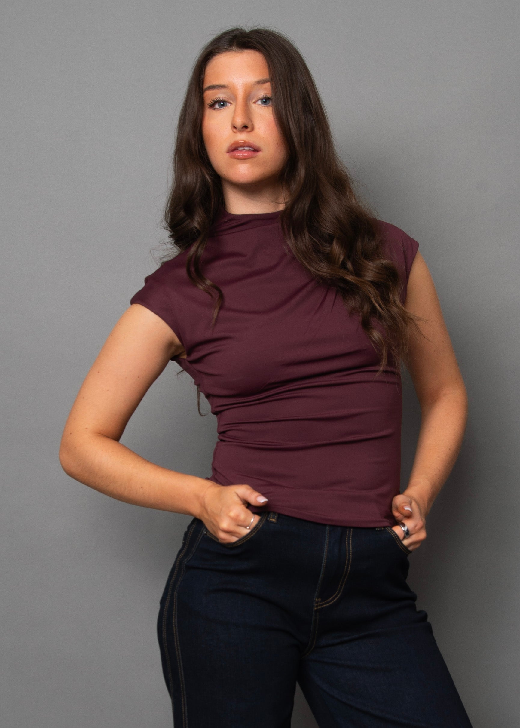 This Yvette Funnel Neck Tee in prune is made with buttery soft fabric, this tee features cap sleeves and a flattering funnel neck with ruching. You'll love the luxurious feel and chic profile of this must-have wardrobe essential.